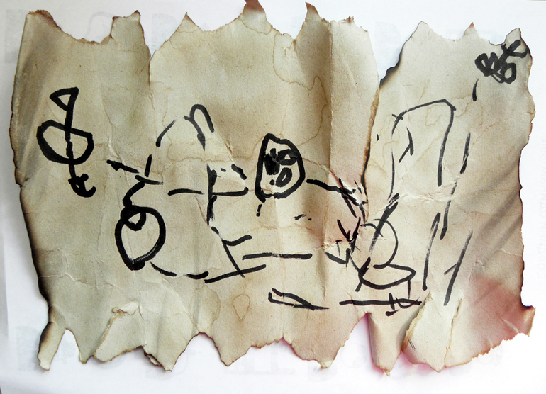 Чтобы найти наш домашний Остров Сокровищ, пришлось подготовить карту! Состарили лист картона, вымачивая его в кофе и затем поджигая краешки) Затем Соня нарисовала маршрут, понятный только ей самой))):