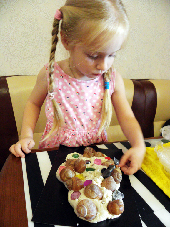И вот наконец-то наш Остров сокровищ - соленое тесто, раковины виноградных улиток, всякие бусины.