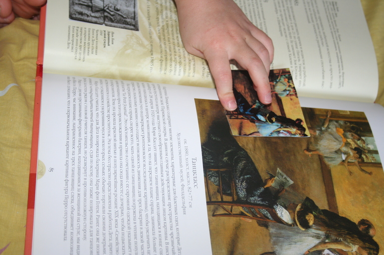 Как я и надеялась, такой способ рассматривая картин пришелся Камилле по душе, и пусть это не романтические вздохи над красотой полотна, все-таки эти полотна она рассматривает, обращает внимание на мелочи и обстановку и очень-очень много запоминает. И самое, наверное, для меня приятное, что она почти каждый день просит поиграть с Эдгаром Дега (ее слова) и узнает его на всех автопортретах :-)
