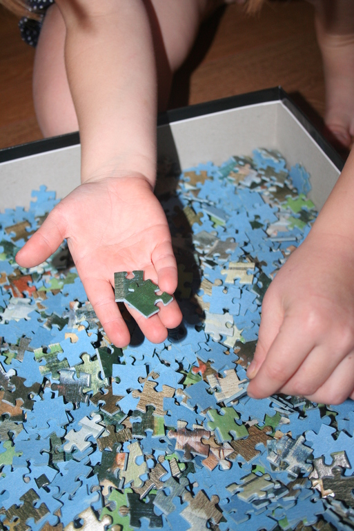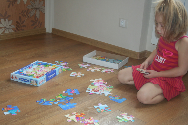 Еще мы играли с пазлами. Как раз вовремя к нам приехала тематическая новинка, и Камилла совершенно самостоятельно собрала свою первую картинку из 40 кусочков! Правда, повозиться пришлось :-)