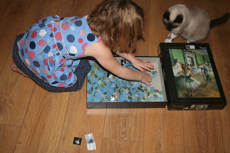 Были у нас и другие забавы, например, игра "Кто ты?", при помощи которой мы знакомились с масштабным творчеством Эдгара Дега. Все дело в том, что Камилла, несмотря на то, что я считаю ее очень усидчивым ребенком, просто терпеть не может никакие презентации и рассматривание картинок. Ей это скучно, и она сразу хочет убежать. И какие бы хитрости я не придумывала, ее внимание хватает от силы на пять минут.
