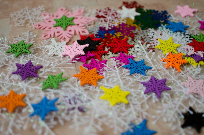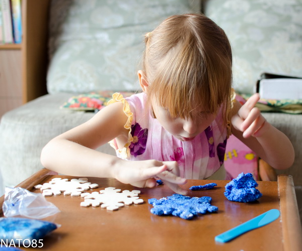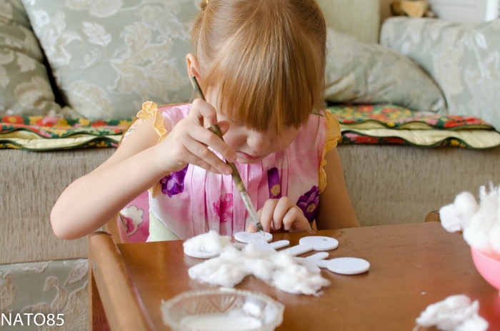 Здорово позанимались! Видно, что доче не скучно!А чем вы таким интересным синим снежинку украшали?