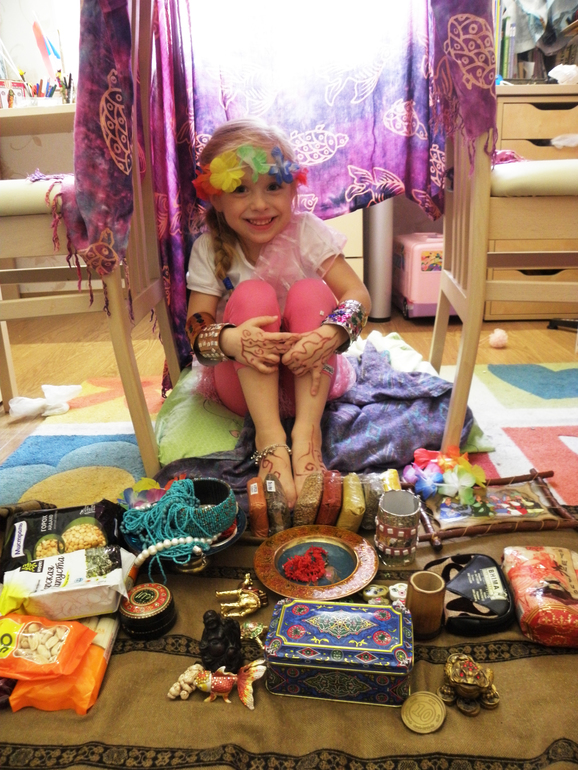 Еще рассказала, что Индия известна своими пряными травами и специями, очень колоритными блюдами. Так что поиграли в продавца на индийском базаре, Соня с раскрашенными руками и ногами со всем нашим богатством: украшениями, фигурками, специями, что-то из Индии, что-то куплено здесь, что подходит для погружения в атмосферу)))