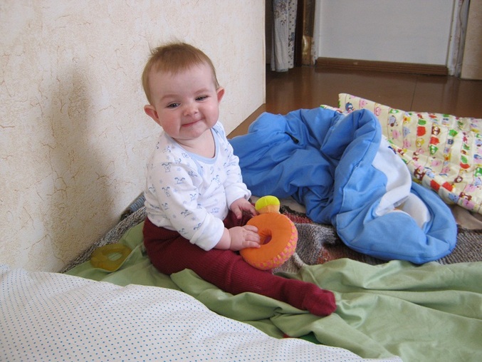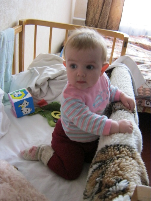 Сегодня я посадила в кроватку, а сама стала фоткать. А она завалилась и ударилась головой о прутья. Я ее сразу схватила, так что недолго плакала.