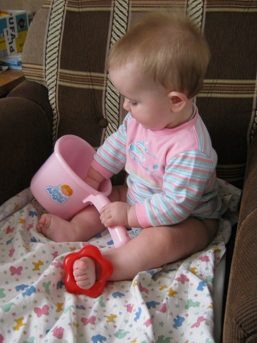 Забавлялась тем, что сидела на кресле и выкидывала игрушки. Мама охала и ахала и только успевала их подавать. Полина хохотала и визжала.