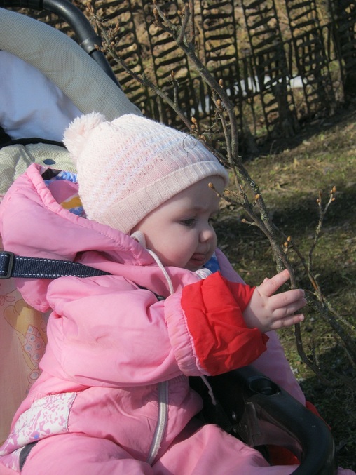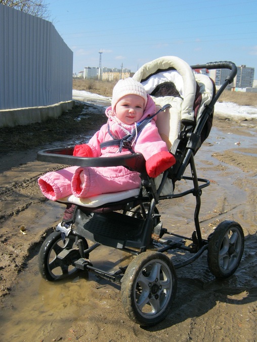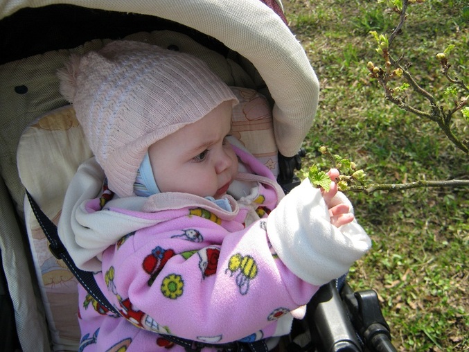Первая прогулка в сидячем виде! Покатались по лужам и грязи. Полина не слишком заинтересовалась окружающим пейзажем. Смотрела на лужи и тень от коляски. Еще потрогала веточку от куста смородины. Потом посидела у папы на плече, шее и даже на капоте и крыше машины.