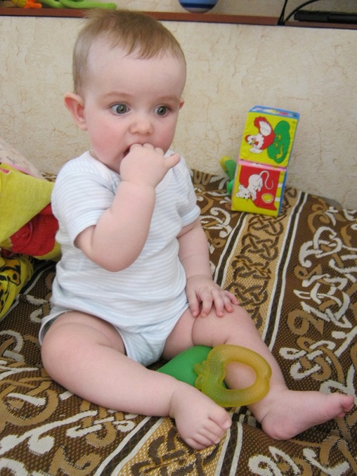 Очень часто становится на четвереньки и качается. Кажется, что вот-вот сядет. Так на бок завалится и на одну руку опирается (другой попу щупает). Кстати, уже и уши нашла, периодически щупает.