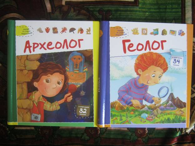 Первые недели две у нас был только Археолог и Геолог. Многократно рассматривала со мной и сама, и с дедушкой, и с бабушкой, и на сон всегда читали. Эти книги мне очень нравятся, там окошечки и информация для детей об этих профессиях. Особенно мне нравится Геолог.