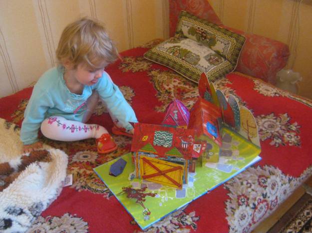 Книга большого формата 25*31 см и объемная (еще бы ведь там запрятан целый дом). Она состоит из короткого рассказика, листа с монстриками, странички с карманом и ДОМА! Это просто волшебство какое-то: раскрываешь - дом (нужно еще его зацепить за картонную петельку, чтоб не сворачивался), сворачиваешь - дом складывается. Несмотря на то, что он кажется не из очень плотного картона, он прочный. Мы его вот уже вторую неделю раскладываем по нескольку раз в день и он такой же целый. Ребенок играет аккуратно, несмотря на юный возраст. Я спокойно могу оставить дом с ребенком и уйти заниматься своими делами. В домике есть окошки, парочка подвижных элементов, можно его крутить со всех сторон и рассматривать внутри и снаружи, заглянуть в конюшню, на кухню. В книге еще есть лист с монстриками, они легко достаются, как вырубки. Чтобы они не растерялись в книге предусмотрен специальный карман. Такими монстрами дочка играет как фигурками. Рассказ очень незатейливый на 2,5 разворота, но дочке нравится и мы читаем его несколько раз в день».