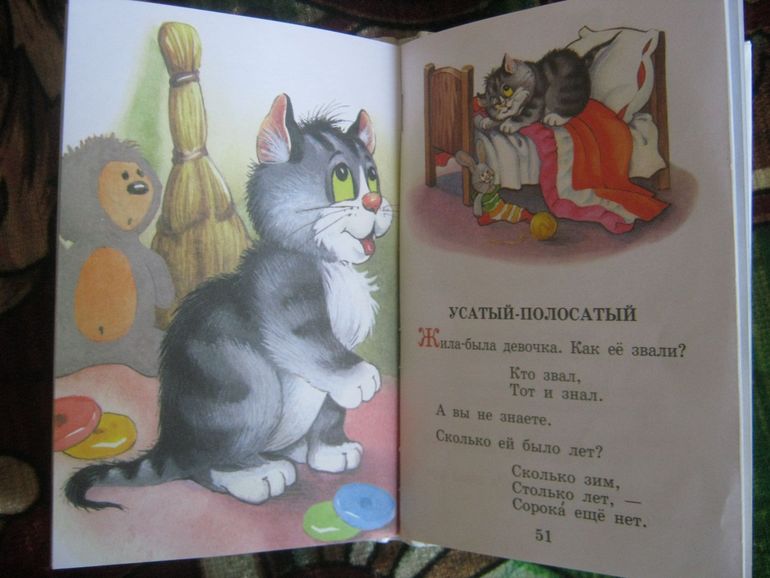Опять, мама недоумевает. Купила пару месяцев назад, дочке не интересно, я даже в Бресте ее и оставила. Но время этой книги тоже пришло. Читаем в конце мая только ее. Чтобы прочитать от начала до конца надо потратить 17 минут! И попробуй чего-то пропусти. Все слушает внимательно. В книге несколько стихов: Тихая сказка, Сказка про глупого мышонка, Сказка про умного мышонка, Урок вежливости, Усатый-полосатый, Два кота.
