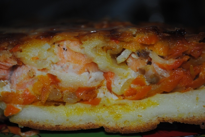 Начинка: лосось свежемороженный, лук-морковь обжареные.....