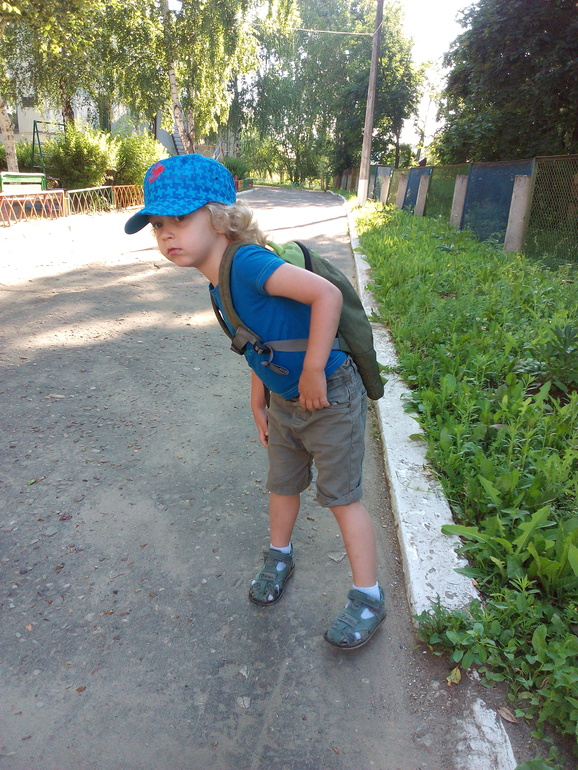 Григорий всегда сам носит с собой воду,влажные салфетки,пластырь и перекись.Он знает,что ЭТОТ набор просто необходим на каждой прогулке.Это у него в рюкзаке НЗ(неприкосновенный запас). Дальнейшее "забивание" свободного места уже по степени нужности лично ему)))))) Обычно наши любимые динозавры занимают всё оставшееся свободное пространство)