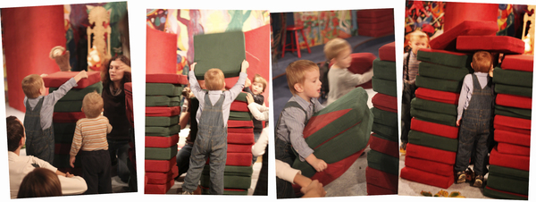 Затем 2-3 летние детки строили домик. Как положено - с крышей и входом:)