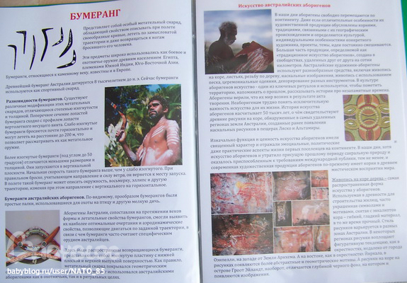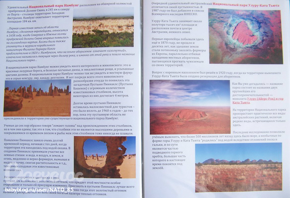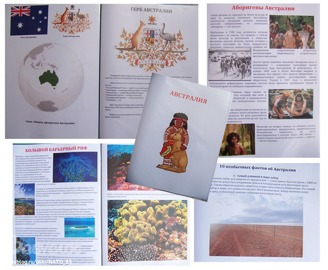 Может следовало сделать поменьше текста, но так хотелось иметь под рукой информацию и для себя (для рассказов и объяснений) получилось так. В наше пособие вошли странички рассказывающие о самой Австралии, ее гербе, местных жителях, достопримечательностях, животных и некоторые интересные факты и рекорды Австралии.