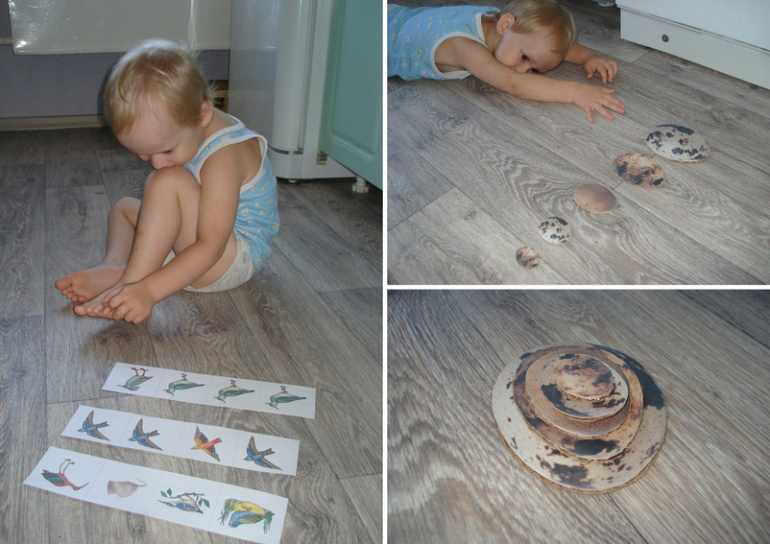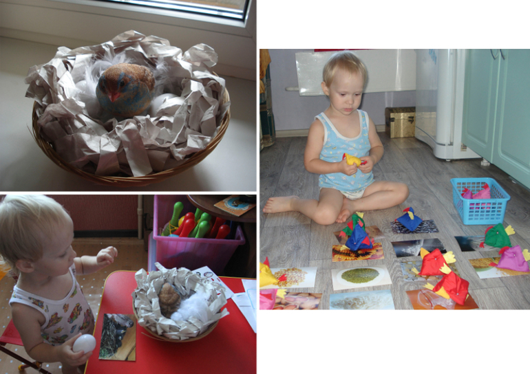 Очень понравилось гнездышко с мамой-птичкой и яичками. Посмотрели картинки птенчиков. Думаю кое-что он уловил. Потом воспользовались нашими замечательными птичками-мешочками с разными наполнителями, разложили их по картинкам.