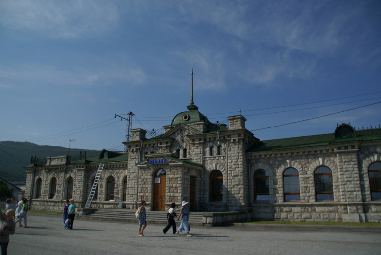 Начать знакомство с Байкалом (моя подруга-москвичка впервые была в этих местах) мы решили с познавательного (это после пары дней расслабляющих прогулок по Иркутску с элементами шоппинга)) и отправились на экскурсию по Кругобайкальской железной дороге. Свое второе имя - "Золотая пряжка" Транссибирской магистрали - Кругобайкалка получила за свою немалую стоимость (при этом став самой дорогостоящей железной дорогой за всю историю страны), обусловленную технически сложной постройкой множества тоннелей в прибрежных скалах, мостов через притоки, защитных галерей... Большей частью использовался ручной труд (строительство велось в начале двадцатого века), а проекты разрабатывали лучшие инженеры не только России, но и других стран. Кроме того, "золотым" этот участок дороги зовется благодаря окружающим живописным ландшафтам... Здесь покажу свои, "живые" фото, а в том же Яндексе можно найти предостаточно профессиональных снимков. Сразу оговорюсь, что иногда будет попадаться и мое лицо (либо спина), при отсутствии аналогов без оных))) Вот это, например, вокзал в г. Слюдянке, уникальный тем, что полностью выстроен из мрамора (в этих местах он белый и розовый):