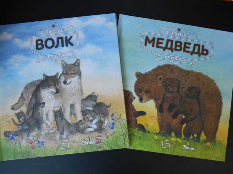 Текста в книгах немного, но он информативный, ровно то, что нужно! Некоторые факты из жизни волка и медведя я и сама узнала впервые! Текст написан простым и понятным языком. Отличные книги для расширения кругозора!