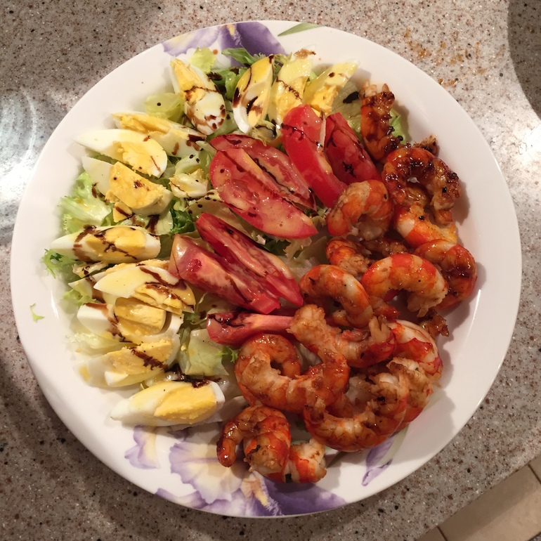 Это ужин. Хоть и приготовила не себе, но ужин такой допускаю (конечно для меня нужно пол порции), потому что здесь соус на основе желтка, горчицы , лимонного сока и оливкового масла, бальзамический соус, а креветки отварены и обжарены прям три минуты в помешивании с соевым соусом. Кто не худеет-гренки из духовки!