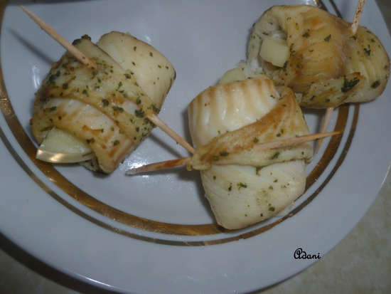 Рулетики из камбалы с сыром. Филе камбалы замариновать (соль, перец, сушеная кинза, лимонный сок или уксус, оливковое масло) и оставить на минут 20. На филе выложить кусочек сыра, завернуть в рулет, сколоть шпажкое и на противень, сверху полить сливками. В духовку на 20 мин. при 180.