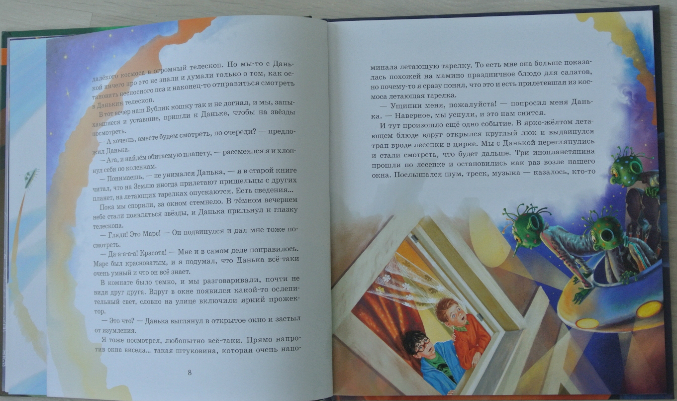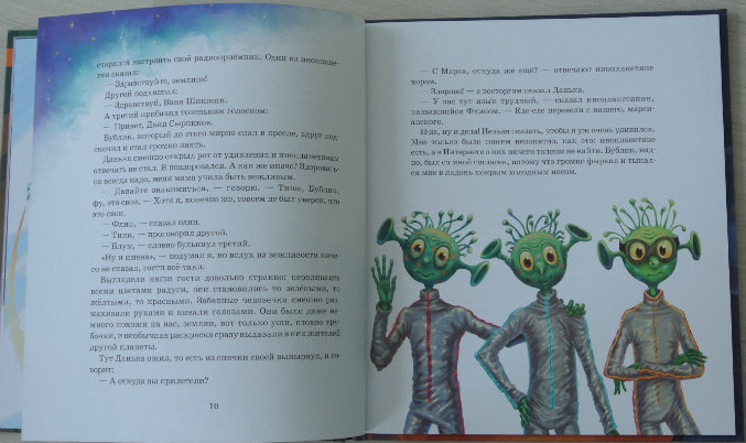 2 друга, один из которых увлечен астрономией и верит в НЛО. И инопланетяне-таки прилетают на нашу планету:). В конце книги есть огроменная игра-бродилка (чет забыла сфотать). Иллюстрации компьютерные, да. И полиция (милиция?) не русская, а соседей наших - украинская. Символика опять же - издательство же украинское. У нас есть несколько книг этого издательства - очень довольна.
