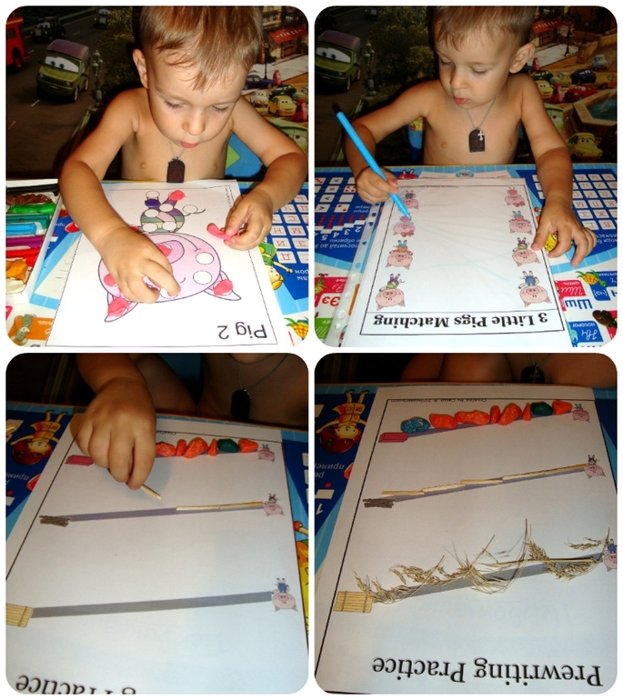 Нашел что лишнее и какой домик из какого материала построен. А вот с фрагментами (где мордочки поросят) он растерялся, Объясняла ему по пяточкам.. но все равно не выполнил, видимо для него мордочки слились.. а вот с фрагментами одежды на раз - два...А так же с легкостью выполнил задание, где фрагменты мордочек сразу трех поросят