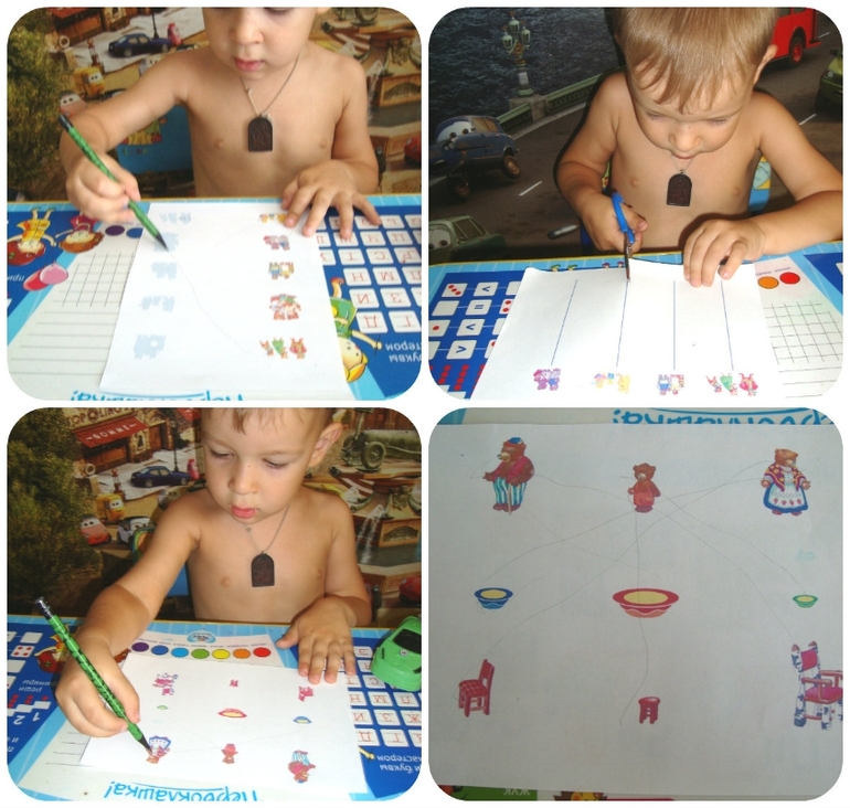 Выполнил КИрюша задание с наклейками из книги Чудесные наклейки. Там нужно было рассадить медведей по стульчикам и раздать им тарелки с малиной.