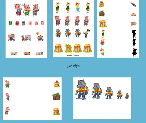 Читали вместе по картинкам. Выполняли задания (с того же сайта, что и три поросенка). Находили пары, лишний предмет и выкладывали дорожки из камней до домиков.