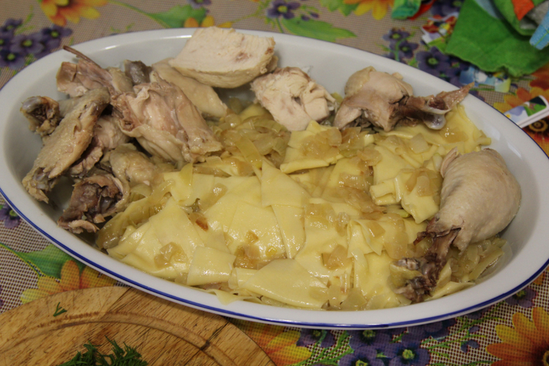 Отвариваем пол курицы , отдельно в сотейнике в сливочном масле томится лук репчатый до слегка коричневого цвета. Курицу по мере готовности режем порционно.