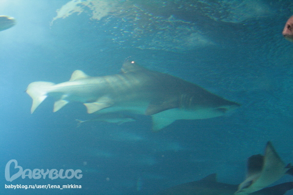 Но, как говорится, все скороговорки не перескороговорить не перевыскороговорить, так и всех рыб океанариума снимать не переснимать. Там их очень много, разных морских бассейнов. И средиземноморские, и рыбы красного моря, и океанические. Так же обитатели арктики и антарктики. Все не буду выкладывать, покажу только акулу с дитенышем: