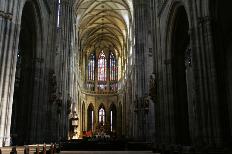 Сам собор выполнен из песчаника, и как все готические постройки 13 века лично мне внушает благоговейный страх. Я люблю любоваться такими сооружениями издали.т.к. вблизи я не то что чувствую себя букашкой, но как-то да, чувствую себя мелкой. Да и песчаник в годами темнеет и становится черным, все эти статуи гаргулий и прочей нечести, которые призваны отгонять нечесть меня пугают. Даже не то что бы пугают, просто рядом мне не по себе. Итак, собор Св. Вита: