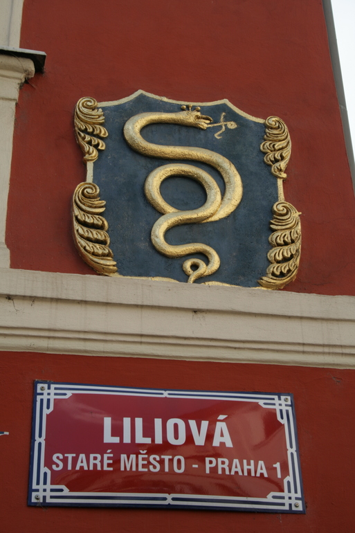 Раньше, когда еще не была придумана нумерация домов, дома не только красили в разные цвета, но и исхитрялись как могли. А могли так: каждый на своем доме вводил разные рисунки, скульптуры, лепнины. Были синие быки, золотые колодцы, красные лошади и т.п. Вот, например, дом у "Злата Гада" (дом у золотой змеи):