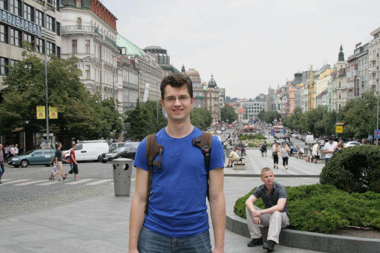 Меня площадь сама как-то не впечатлила, поэтому вменяемой фотографии нет. Есть только фото с мужем, за его спиной Вацлавская площадь длиной 700 метров.