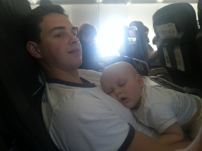 Дима играл, ел, пил, спал, знакомился с пассажирами сзади нас - улыбался им и болтал, теребил тканевую книжку, выданную Swiss, грыз самолетик от них же, любовался облаками, рвал журнал и облизывал края инструкции по технике безопасности. Немного поднывал, когда хотел спать. А в целом, он - большой молодец! Как и папа, на котором так удобно спать!♡♡♡