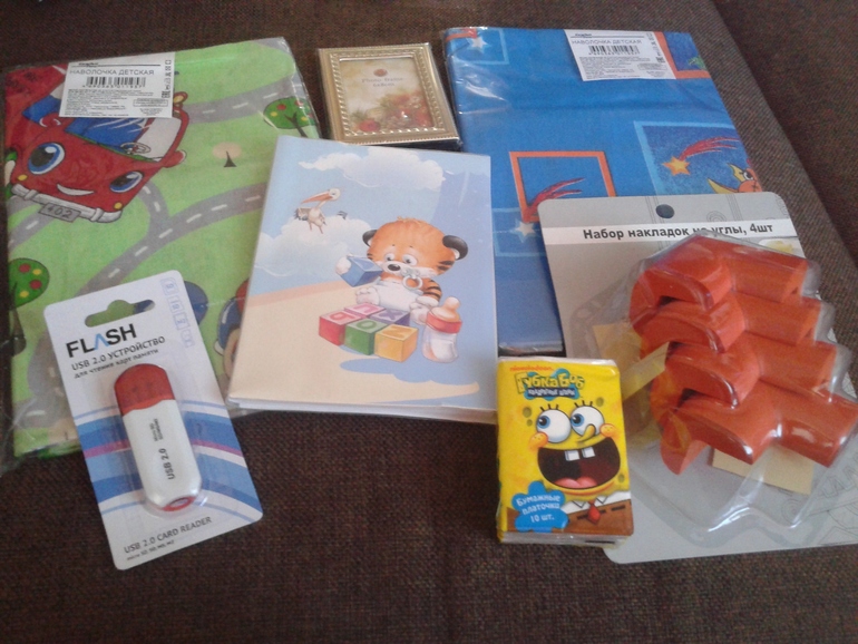 Детские наволочки с очень ярким и красивым рисунком , рамочка для фото , очень классный альбом для фото ( я такие нигде не видела) , салфетки ,очень нужная вещь: накладки для углов и флешка , сын сказал: хорошая вещь, пригодится!!!