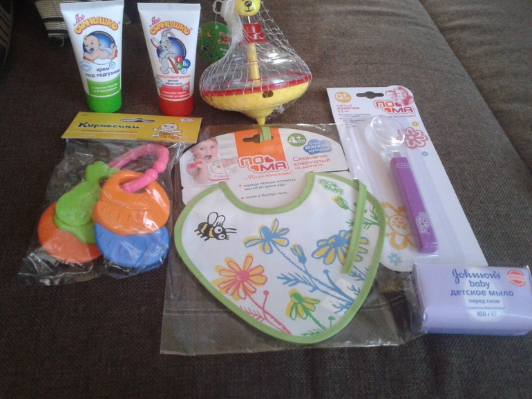 Нужности и приманки для малыша , чтобы он уже поскорее у нас появился ))) Детский крем, зубная паста , детское мыло с нежнейшим ароматом , слюнявчик , игрушки и ложечка для кормления!!!