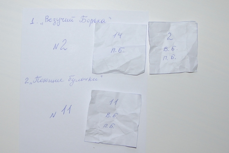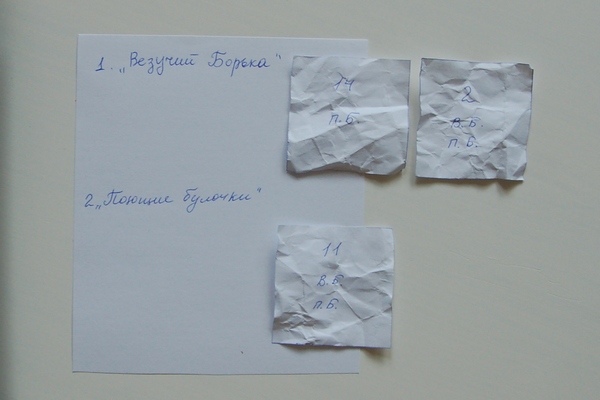 5) 11 сентября я нарежу самых обычных лотерейных билетиков и дети выберут два из них. Уж простите мне неиспользование генератора случайных чисел, мы будем совмещать приятное с полезным. Первый билетик на "Везучего Борьку", второй билетик на "Поющих булочек".