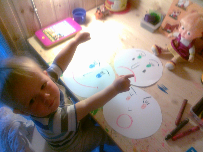 Тематические дниЧто-xто, а эмоции в нашей жизни - это главное! Решила и с Машей немного поиграть в эмоции. На скорую руку вырезала несколько кружков из белой бумаги и нарисовала лица - грустное, радостное, сонное и удивляющееся. Мы экспериментировали со своими лицами, прятались за созданные мной, а потом еще создали свой портрет из подручных материалов. Лица остались лежать на полке, но Маша их часто достает и предлагает играть в эмоции. Это ли не начало актерского мастерства?