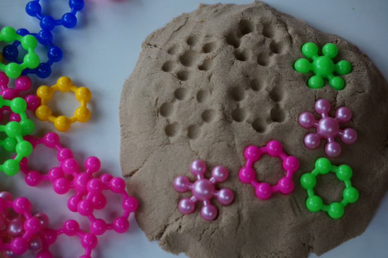 Моторика и сенсорикаНедавно купила Маше новый конструктор, но решила не отдавать его просто так. В шкафу завалялся мешок сахарного песка, который был куплен для варки клубничного варенья, но поскольку ягодки все съедались свежими, то остался без дела. Засыпала этим сладким чудом детальки конструктора и отправила дочь на раскопки. Как всегда, сначала пальчиком, потом двумя руками, потом ложками, потом кидалки-посыпалки, но все детальки были найдены. Мы создали из них гусеницу, которая завалилась на газон - греться на солнышке. А потом, когда надоело, мы ее разобрали и поиграли немного в отпечатки и тыкалки с кинетическим песком, о котором я писала тут.