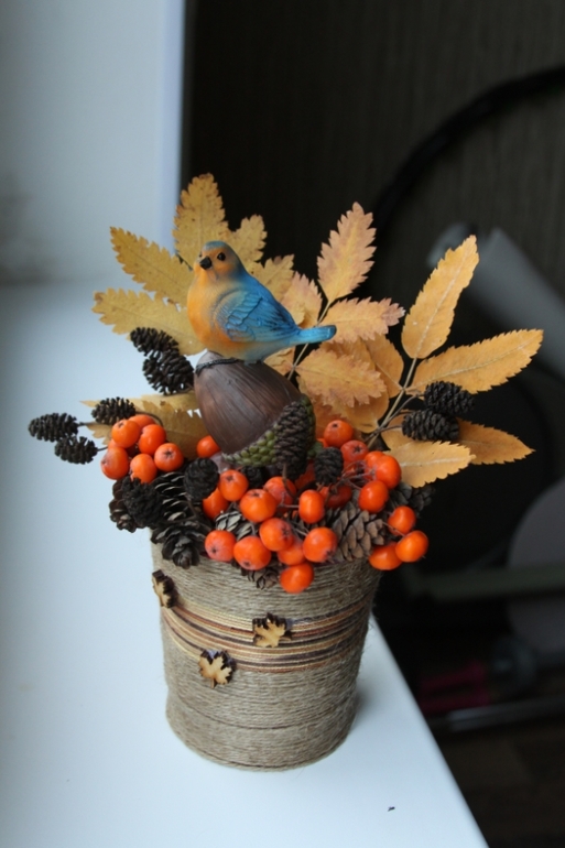 Методист в детском саду была в отпуске. Поэтому быть или не быть выставке осенних работ - мы не знали. А вчера вечером иду - стоят работы! Спрашиваю - как, когда? оказывается, вечером накануне решили - Быть! А на улице помните, что вчера было - все сырое, где уж там материала собрать... Хорошо у мамы все уже давно приготовлено и по коробочкам разложено. Ещё и рябинку удачно обрезали возле подъезда - не пришлось обдирать.