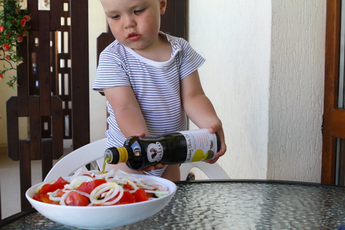 Вот перед вами пример того, как далеко шагнула глобализация. В салате всего 4 ингредиента, но помидоры - болгарские, огурцы - турецкие, лук - французский, а масло - португальское. Об этом я тоже рассказываю Кирюхе, но ему все равно, потому что он знает, что получилось ВКУСНО!