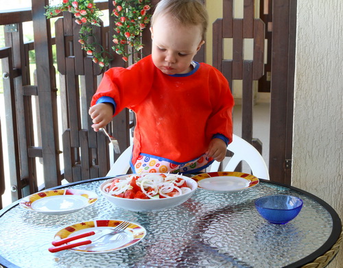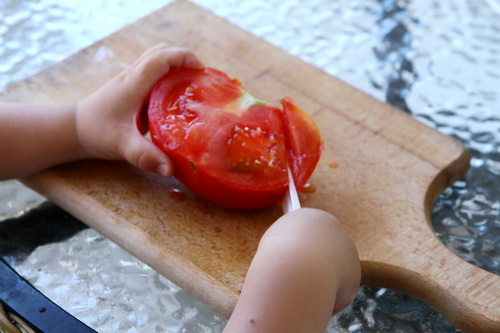 После удовлетворения амбиций artistry приходит время вернуться на землю. Здесь можно было бы написать : «Трюк выполняется профессионалами. Не повторять. Опасно», - но кто же в это поверит. Кстати, с ножами Кирюха, под папиным контролем, конечно, познакомился очень рано. Поэтому ни трепета, ни тяги к ним не испытывает. В руках у него обычный пластиковый, но острый нож, прекрасно режущий болгарские помидоры, о которых я пою уже давно…![]()