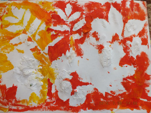 Нам такой способ рисования не очень подходит, сын не любит отпечатки (не вдохновляют они его). Он сразу схватил листья и стал их приклеивать к листу. Затем свободное пространство мы просто замазали красками, затем я отлепила листья.