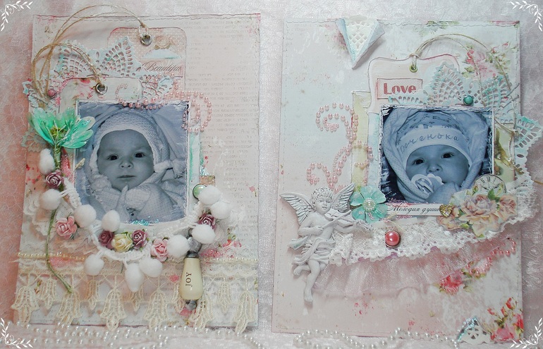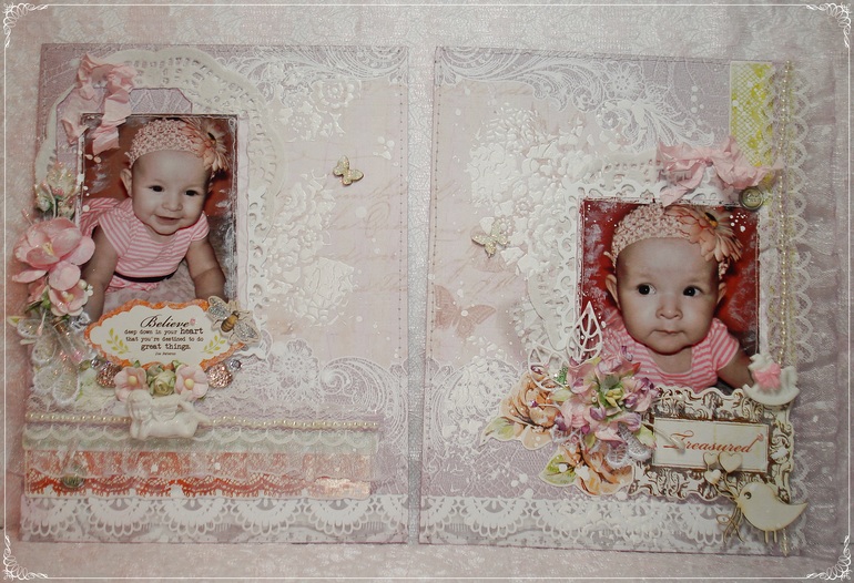 Ну вот и закончила я первый разворот альбомчика по 1му этапу СП Татьяны Дудкиной. Основными условиями были кружево,птицы или бабочки. Несколько дней я размышляла какие же выбрать фото :мои или мамины - в итоге ни те ни другие не подошли под описание "шебби", а вот одни из последних фотографий моей дочурки меня прям вдохновили..и понеслось..бумага,кружево,глиттер, паста, бисер,чип,гипс..цветочки(куда ж без них)))