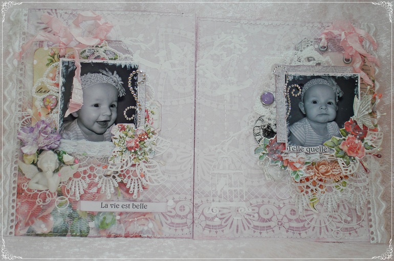 Вот и второй разворотик моего альбомчика готов в СП с Татьяной дудкиной. Основными элементами были сердце и розы!!! Сердечко у меня гипсовое нашлось, а розы...они везде))) еще немного птичек на ветке и в клетке,страз и ангелочек из гипса....фразы на французском La vie est belle-Жизнь прекрасна и Telle quelle-Такая,какая есть.