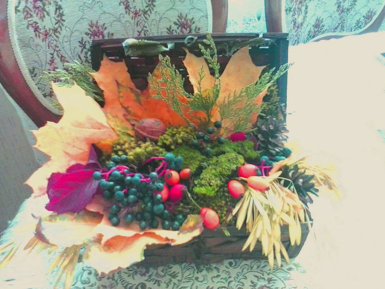 Очень я люблю раннюю осенью, особенно прогулки по парку и лесу. Даня любит пошуршат листьями. Лично мне трудно удержаться, чтобы не собрать букет из разноцветных листьев, насобирать каштанов, еловых шишек. Но особенно это увлекает моего малыша, он с удовольствием подбирает разные палочки, веточки, листики, желуди, его это очень увлекает. У нас для этого специальная большая корзина. Сами понимаете сколько у нас этого добра насобиралось и вот в один дождливый день мы сделали с сыном вот такую композицию. Для основы я взяла флористическую губку, куда Даня на свое усмотрение втыкал листья, ветки, гроздья ягод, а я потом это просто доработала
