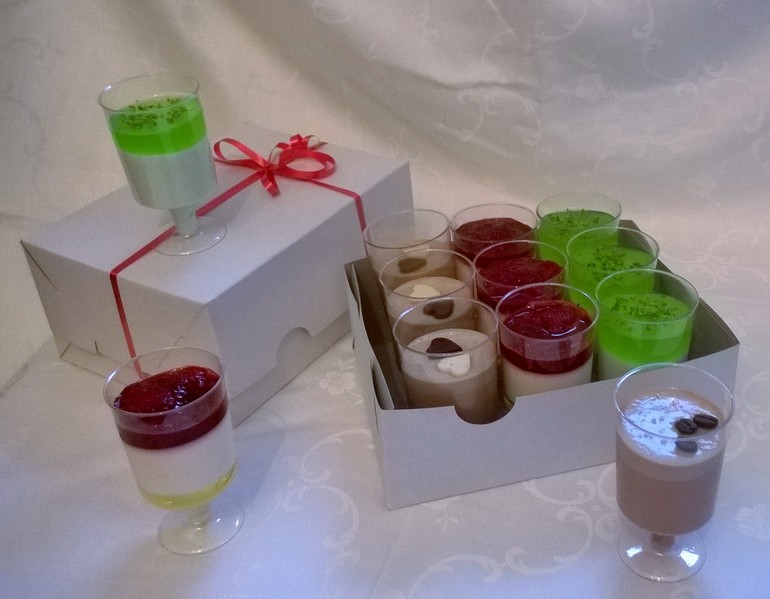 Вкусы - шоколадно-кофейный десерт с фундуком, ванильная панна-котта с лимонным желе и клубничным соусом, мохито (мятный сливочный десерт с лаймовым желе).