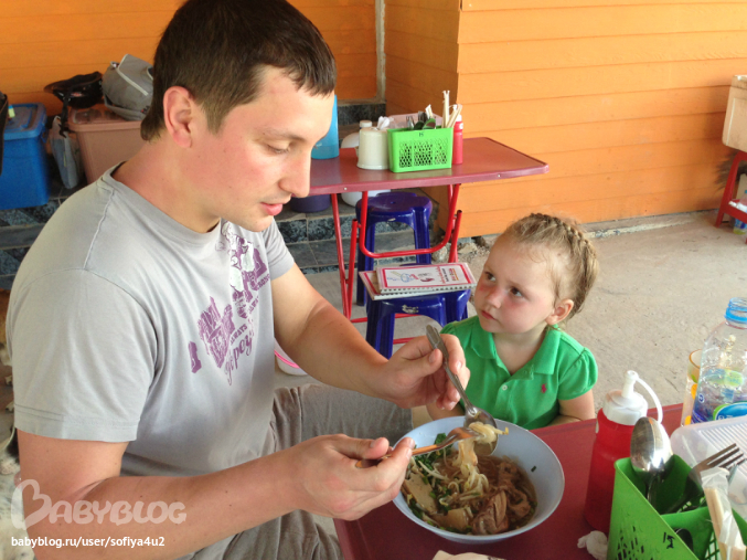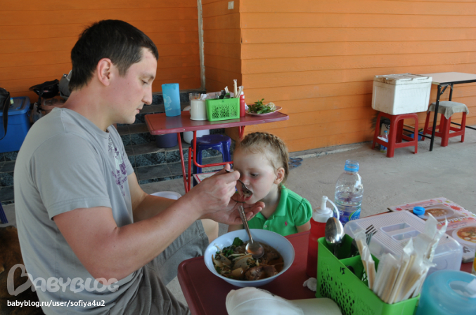Около 7/11 находим заведение не туристического формата, но голодное дите это хуже сотни зоков и мы решились. Порции лапши с курицей хватила на троих. Цена 50 батт. На данный момент у Антона это блюдо №1 в его рейтинге тайской еды.
