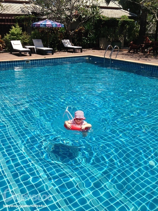 Утро провели у бассейна, так как поздно проснулись, да и Янкин нос еще надо лечить и беречь от солнца.