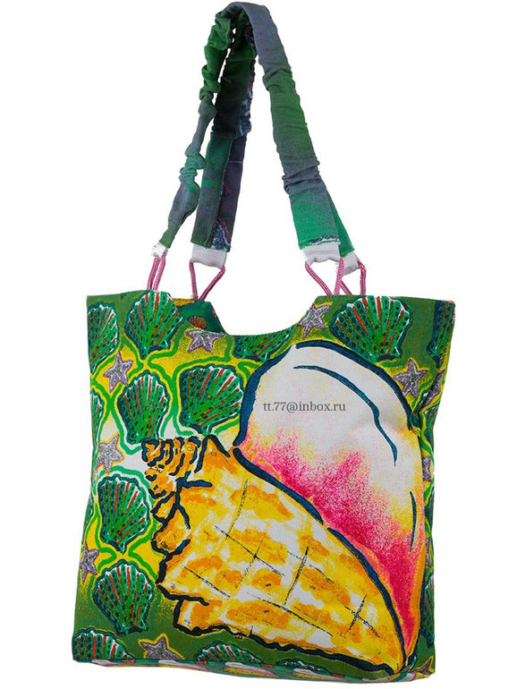 Объёмная летняя сумка с двумя широкими присборенными ручками на петлях-шнурах. Застёжка-молния украшена подвеской-раковиной. Важное дополнение модели - удобный внутренний карман, закрывающийся на молнию.