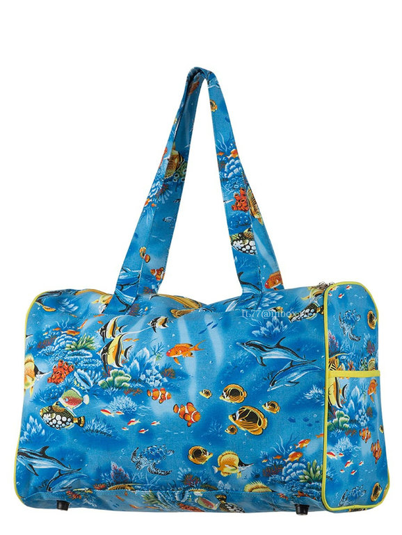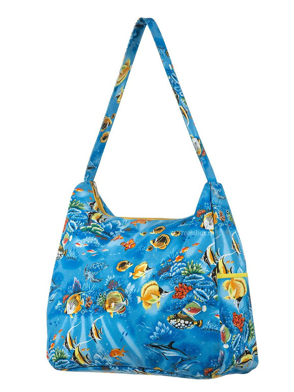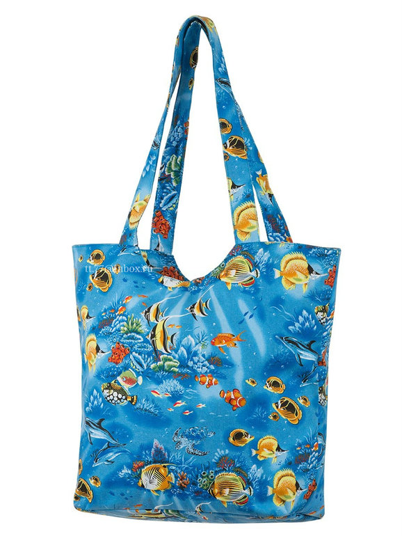 №90051. СУМКА ПЛЯЖНАЯ - 485р. Объёмная сумка с двумя удобными ручками. И сама сумка, и внутренний карман застёгиваются на молнию. Размер: 47*37*17cm Состав: 100% хлопок - верх, рисунок - ПВХ Цвет: принт рыбки